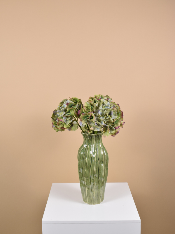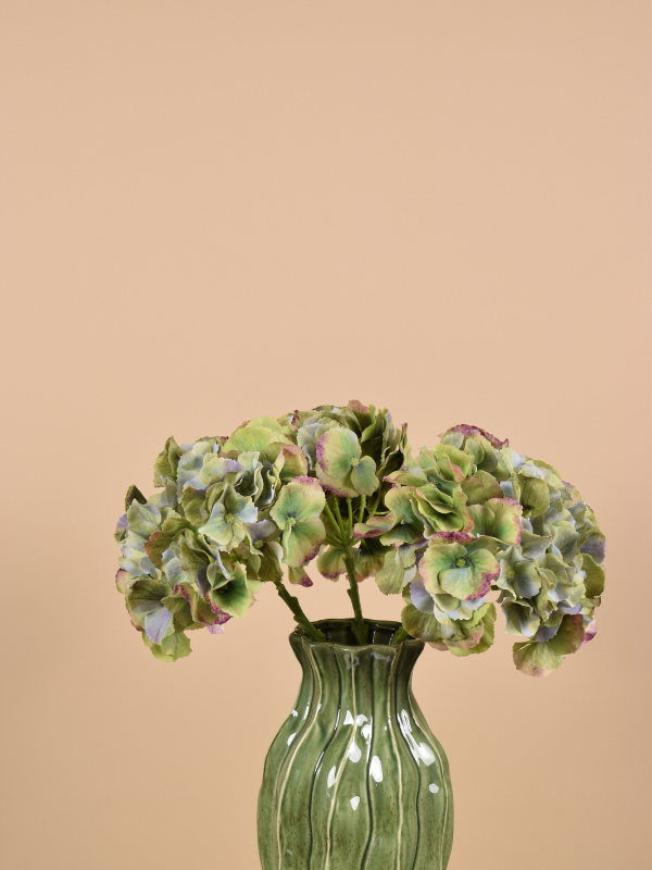 Een zachte hortensia in natuurlijke tinten, met groen, pastelblauw en een hint bordeaux. Een boeket dat voelt als een klein kunstwerk.